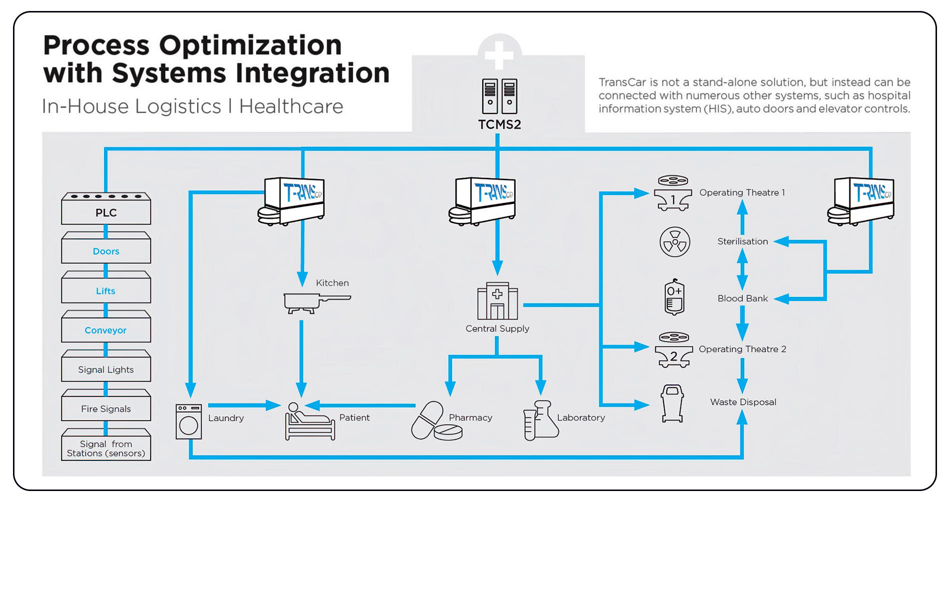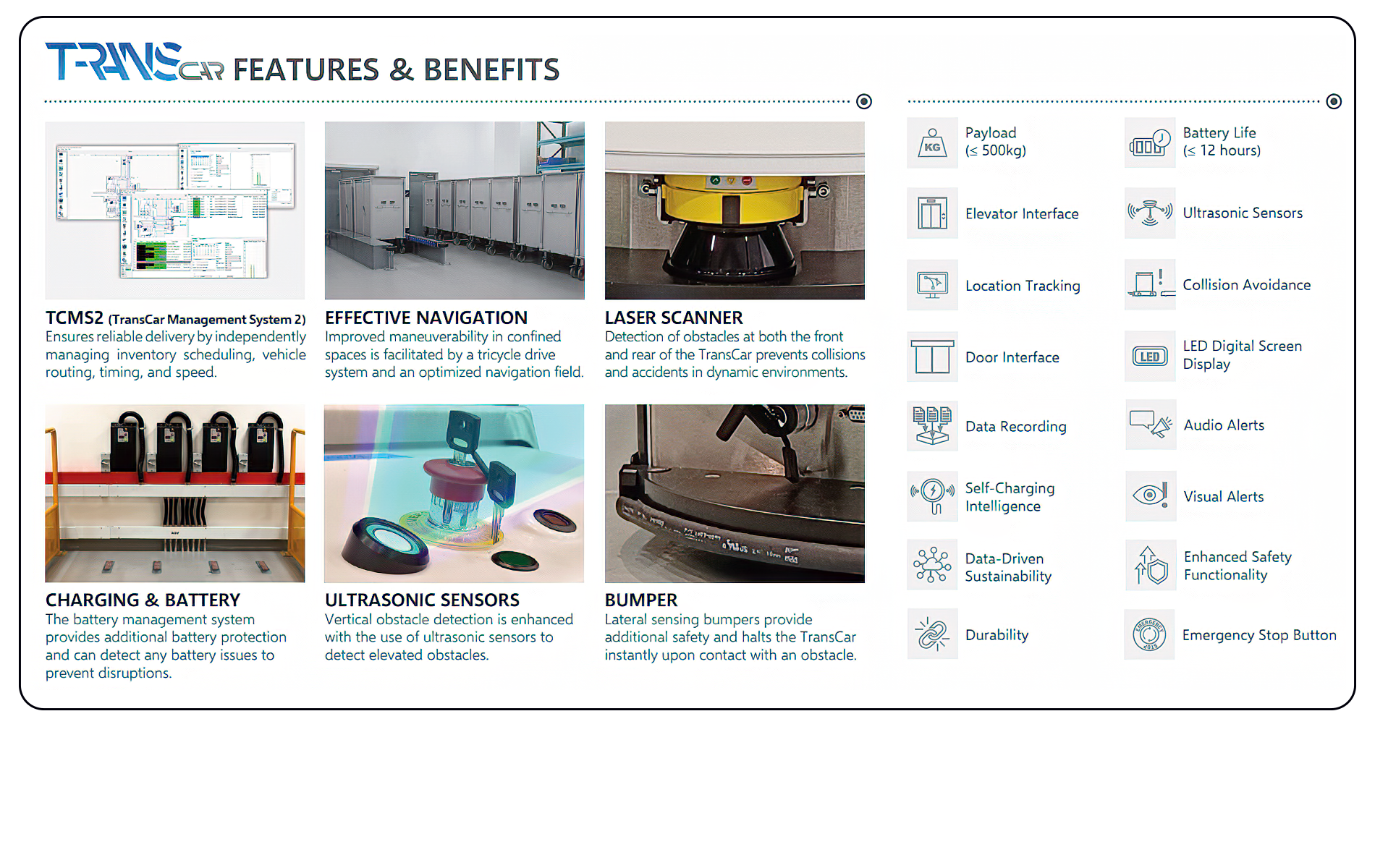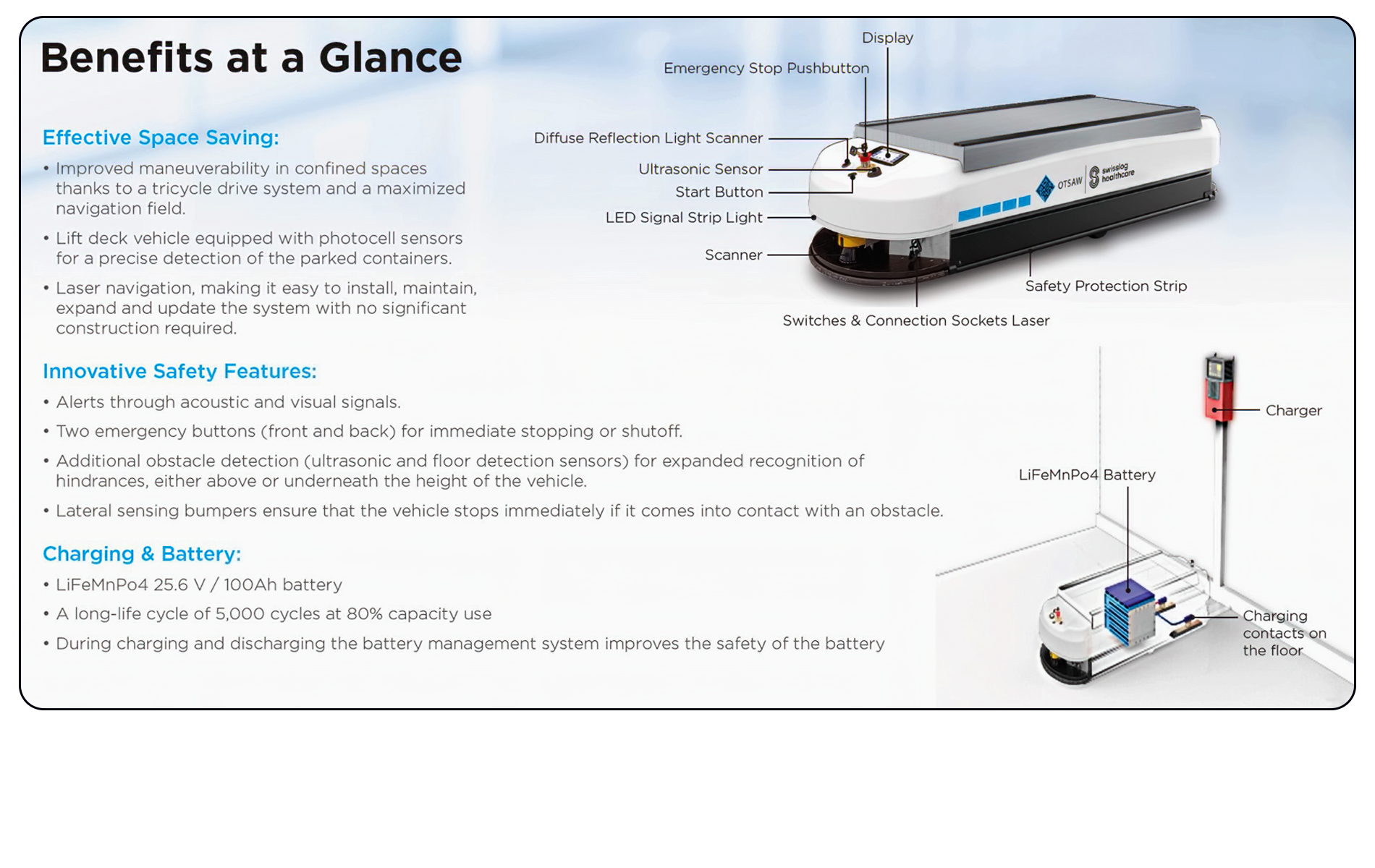 Manufactured by OTSAW, TransCar is a new autonomous materials handling robot. Designed initially for medical campus applications, TransCar enables timely, secure, and sanitary delivery of medical supplies, food supplies, laundry services, waste removal, and much more. Integrating easily with existing logistical, operational, and security IT services, TransCar is a robust, reliable, safe delivery robot-making it a best-in-class choice for automated materials handling applications.