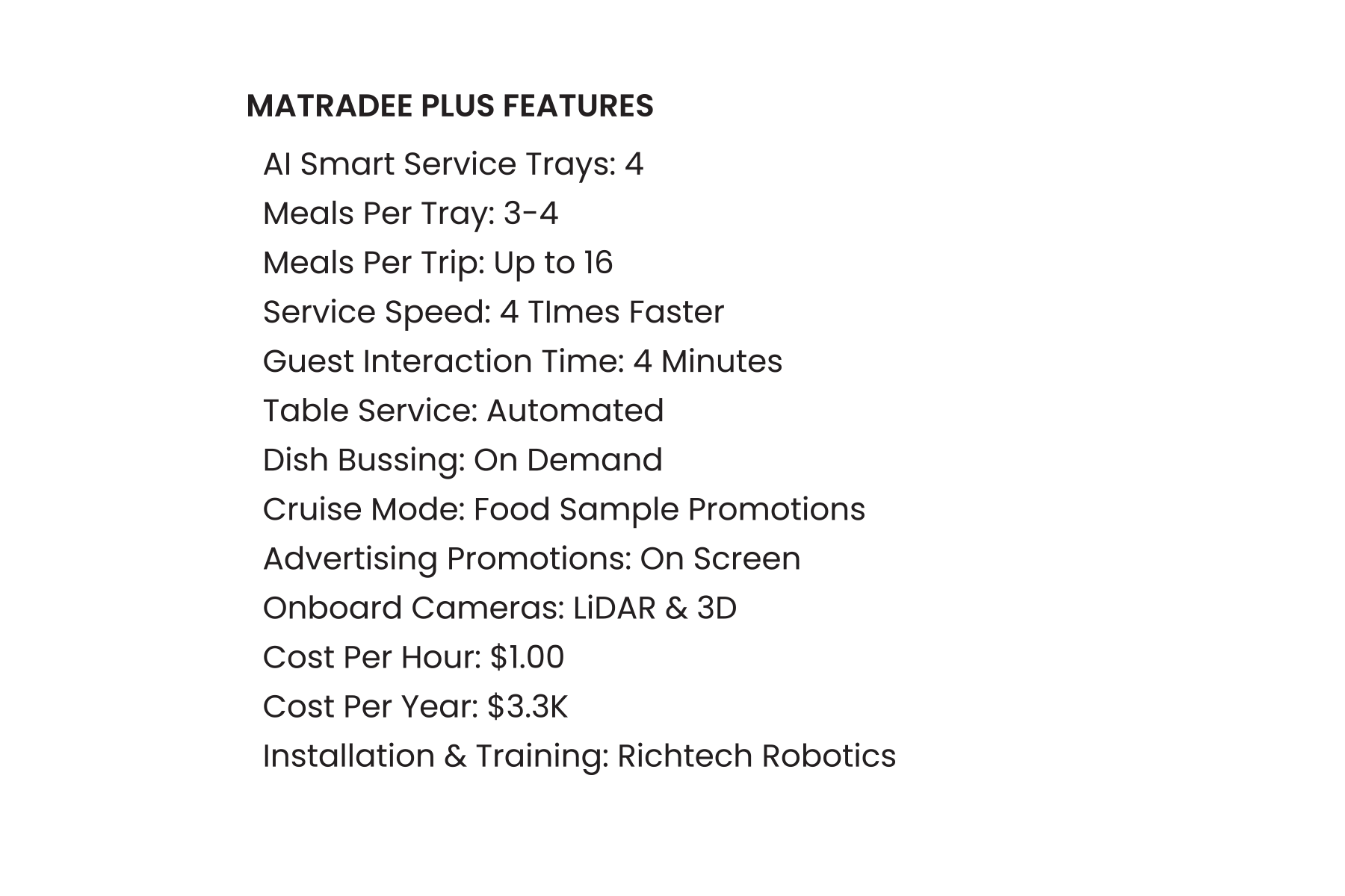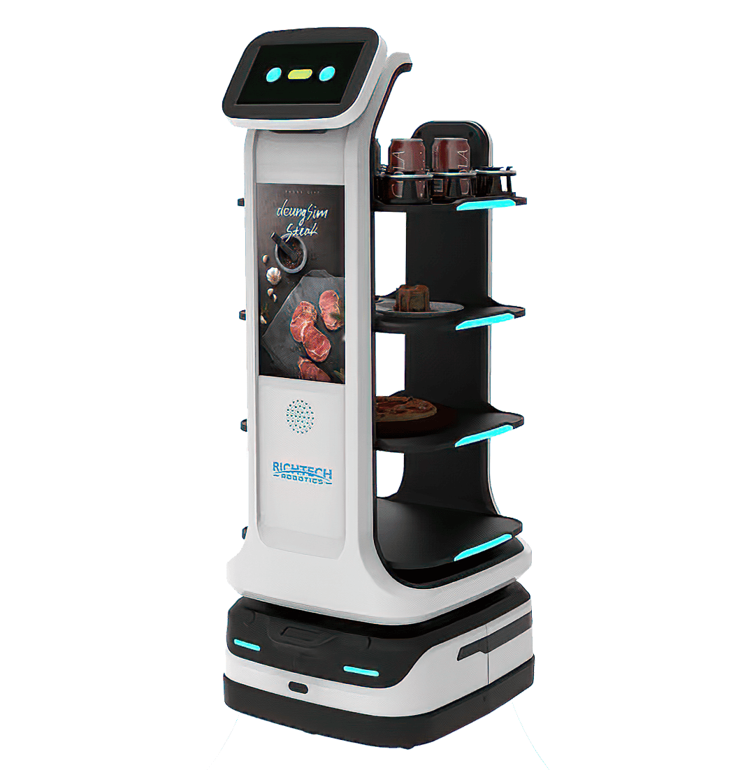 With four large smart trays that carry 3-4 meals each, Matradee Plus makes short work of delivering food orders to customers' tables. Integrating AI with advanced LiDAR and 3D cameras, it navigates your restaurant effortlessly, avoiding stationary and moving obstacles with ease. And when the meal is over, Matradee Plus busses dishes back to the kitchen. Most importantly, it does all this at about 1/3 the cost of an employee. Matradee Plus delivery, workflow planning, installation, and training are provided by Richtech Robotics.