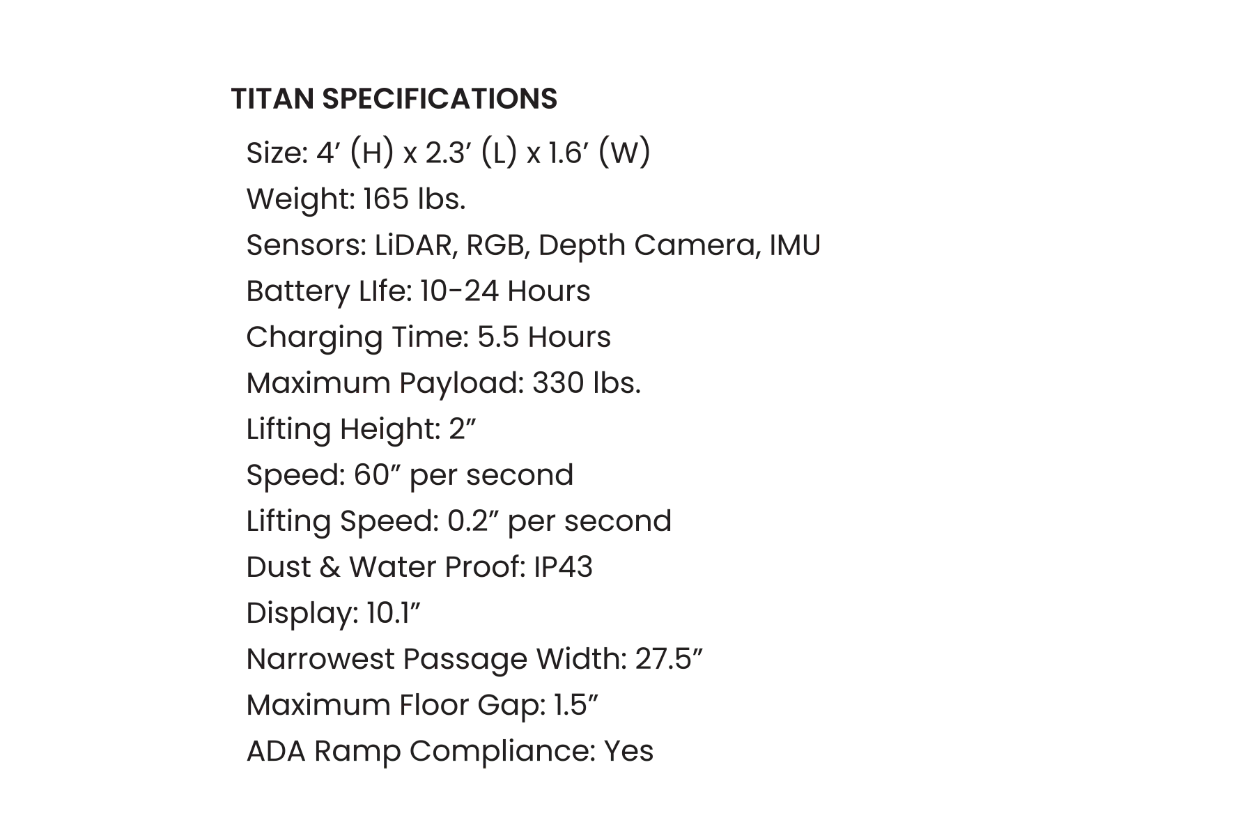 TITAN from Richtech Robotics is a compact materials-handling robot designed to carry payloads weighing up to 330 lbs. With its Shelf and Rack attachments, TITAN is capable of tranporting everything from small cartons and tools to big-box items and auto tires. Regardless of your industry, TITAN can meet your application.