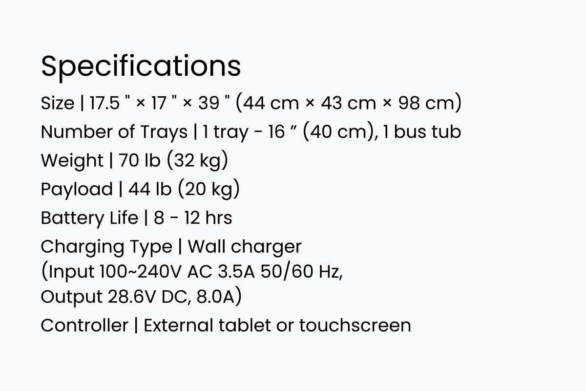 The workhorse of the SERVI fleet, SERVI Mini is capable of transporting an entire table's worth of bussed dishes back to the kitchen cleaning area.
