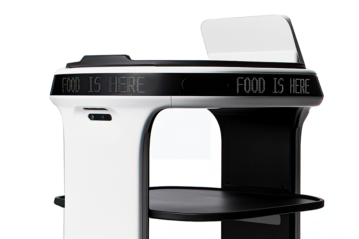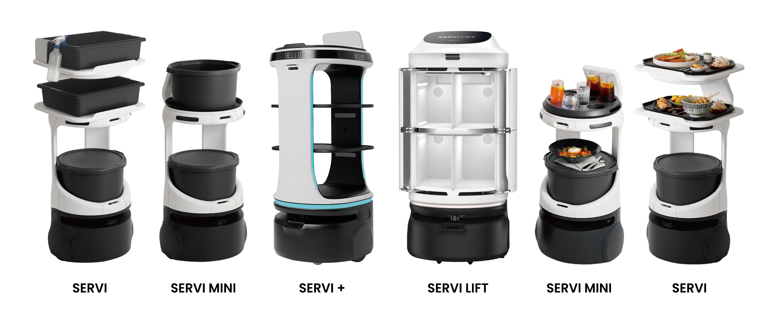 Robots for delivering food to tables and clearing dishes in restaurants, SERVI PLUS. Even room service food and beverage orders can be delivered by the new SERVI LIFT delivery robots.