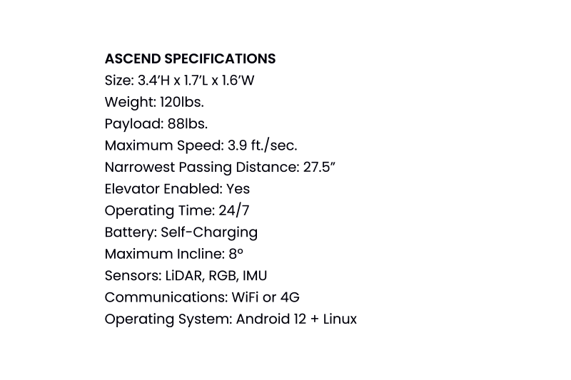 Manufactured by Richtech Robotics, Ascend enhances hotel operations while lowering costs-delivering packages and room service deliveries using secure chain-of-custody technology. With a payload of up to 88 pounds, the self-charging Ascend is elevator friendly-serving multi-floor facilities with ease.