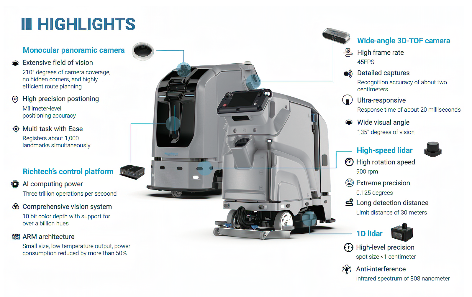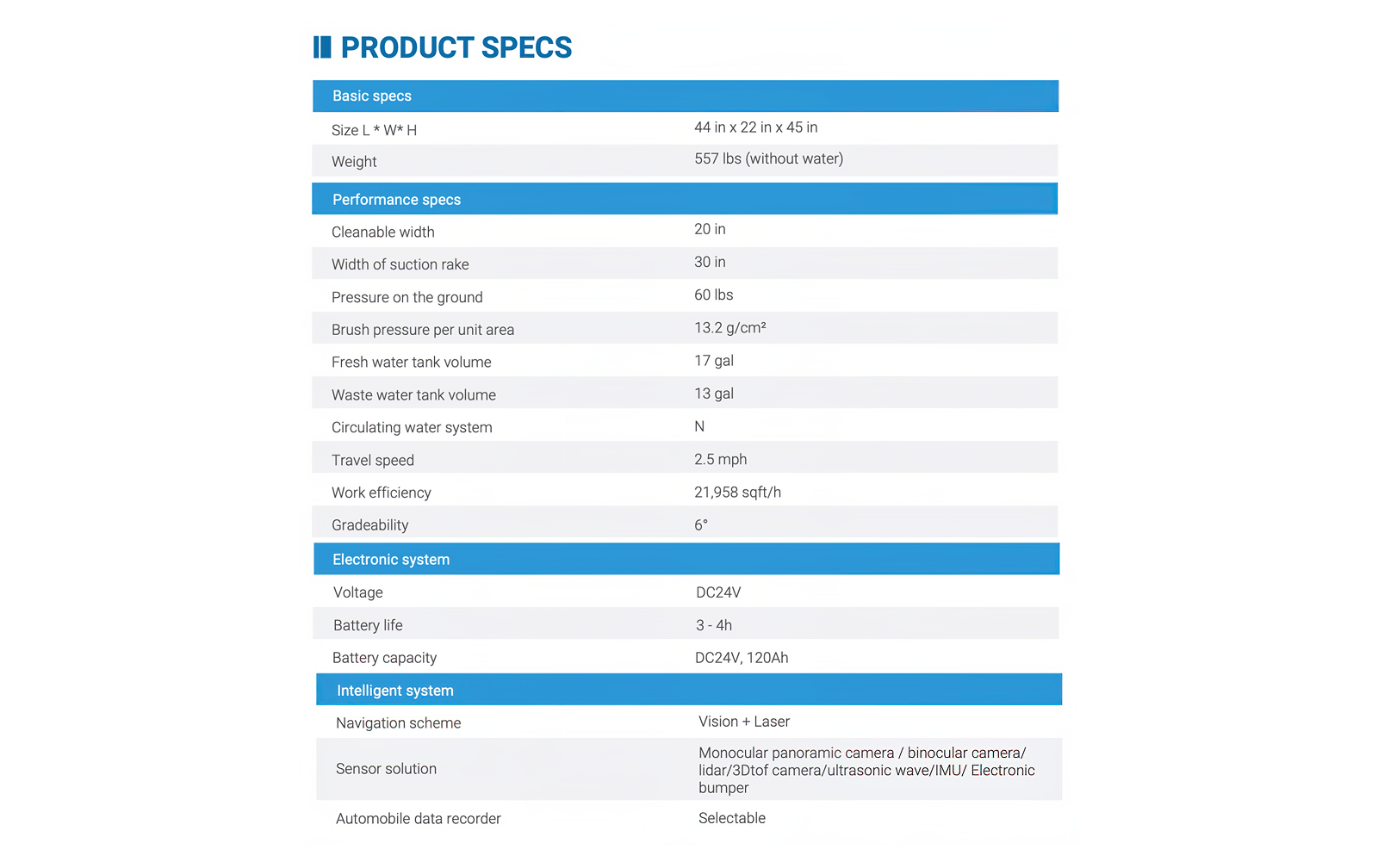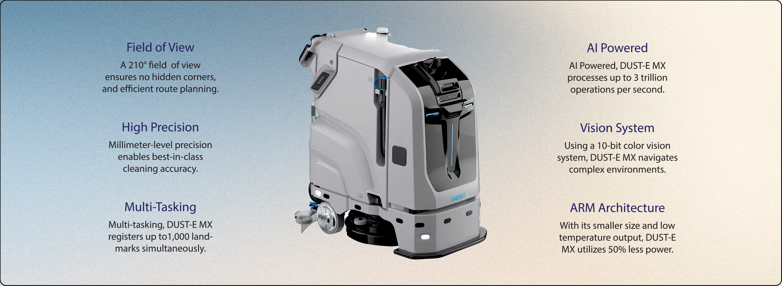 Processing up to three trillion operations per second, DUST-E MX is a heavy hitter: cleaning 22,000 square feet of floorig per hour while safely avoiding obsticals and using 50% less energy.