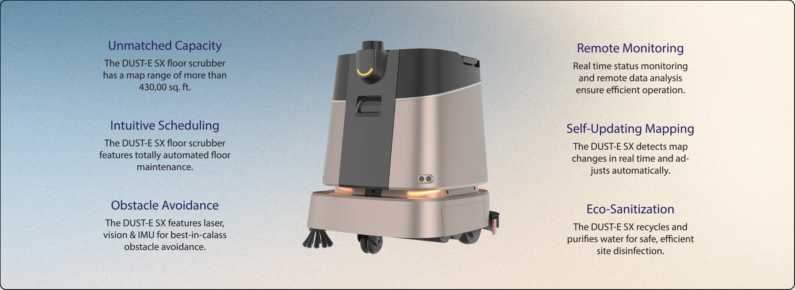 DUST-E SX from Richtech Robotics is one of the first autonomous industrial cleaning robots available. With vacuuming, mopping, and disinfecting, DUST-E SX maintains your floors - all on its own.