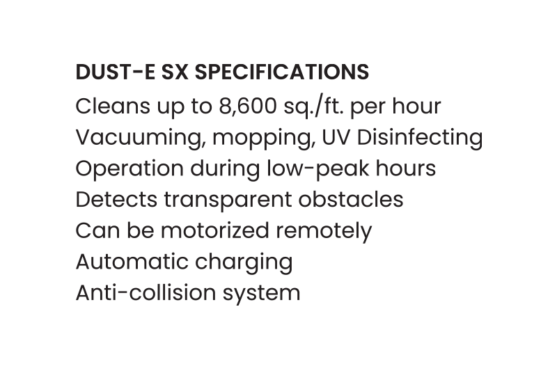DUST-E SX from RichTech Robotics is the first autonomous industrial cleaning robot of its kind. Enjoy clean floors no matter how big the space! With vacuuming, mopping, and UV disinfecting, DUST-E SX maintains shining floors - all on its own. Sold through MetaDolce Technologies, DUST-E SX is a completely autonomous way to keep your organizational floors clean and shining.