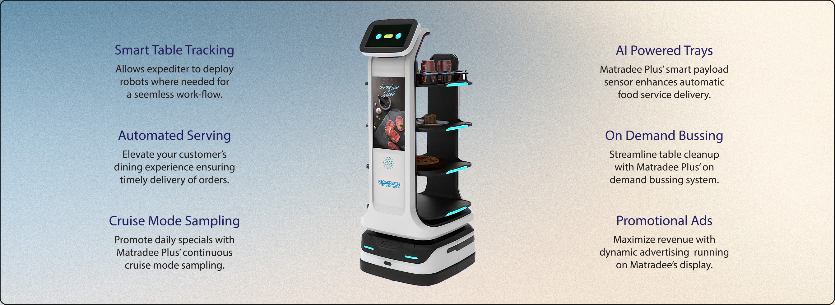 Automating a restaurant workflow is an intensive process. With Matradee Plus, the workflow planning, installation, and staff training are all provided by Richtech Robotics.