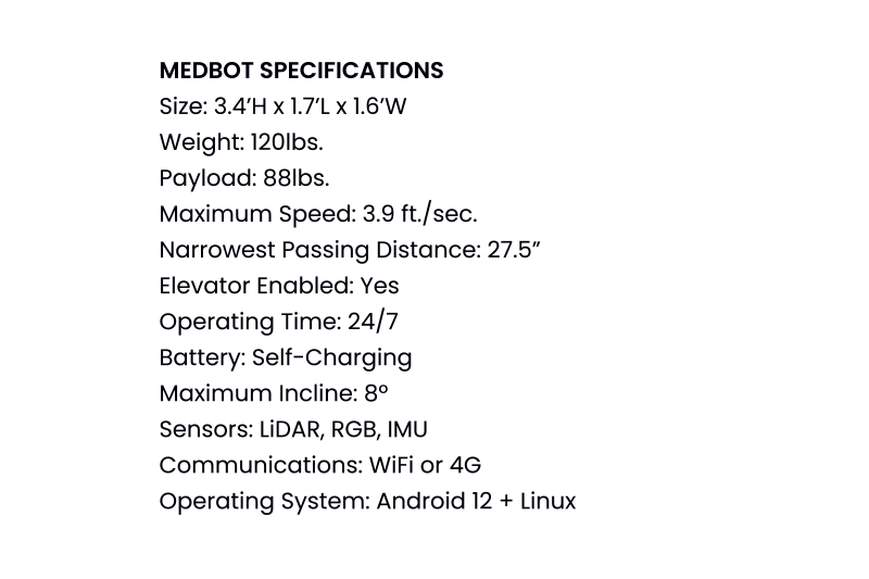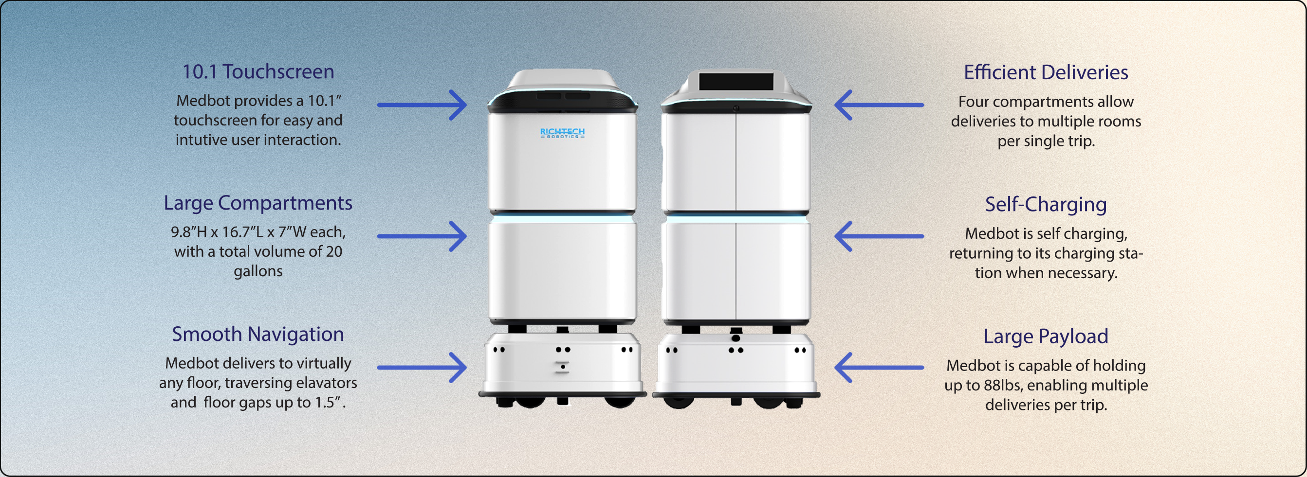 Manufactured by Richtech Robotics, Medbot enhances healthcare efficiency and hospital patient care by automating medical room deliveries using secure chain-of-custody technology. With a payload of up to 88 pounds, the self-charging Medbot is elevator friendly-serving multi-floor facilities with ease.